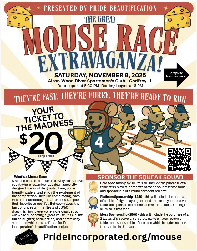 What's a Mouse Race? - A Mouse Race fundraiser is a lively, interactive event where real mice race down specially designed tracks while guests cheer, place friendly wagers, and enjoy the excitement of the competition. Just like horse racing, each mouse is numbered, and attendees can pick their favorite to root for. Between races, the fun continues with raffles and 50/50 drawings, giving everyone more chances to win while supporting a great cause. It’s a night full of laughter, anticipation, and community spirit — all while raising funds for Pride Incorporated’s beautification projects.